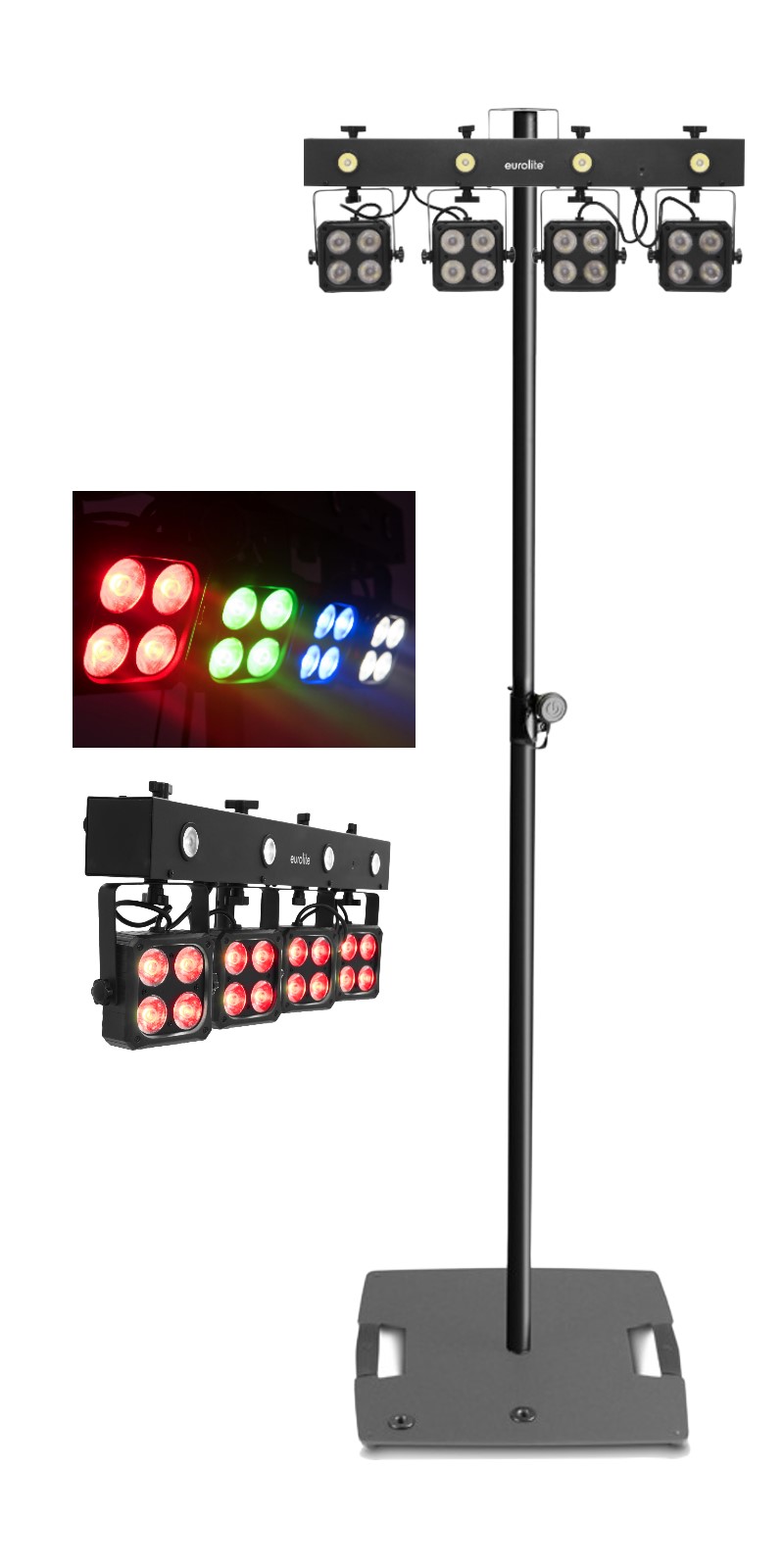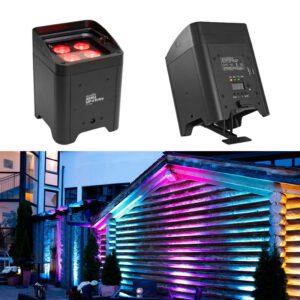 Komplette DMX-LED-Lichtanlage mit wiederaufladbarem Akku. Betrieb auch direkt am Stromnetz möglich. 4 leistungsstarke 8 Watt-RGBW-LEDs (4in1) Spots + Strobe-Effekt mit 4 weißen 1-W-LEDs (Separat abschaltbar!). Läuft mit verschiedenen Modi: Interne Programme, Musiksteuerung über Mikrofon oder DMX. Master/Slave Funktion mit zweiter KLS-180 möglich.